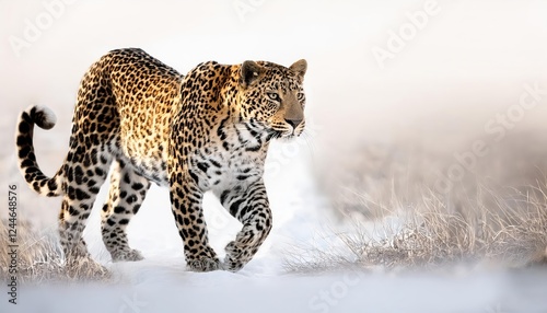 Powerful Stalking Leopard Emerges from Shadows into Bright Savannah Sunlight, Showcasing Majestic Beauty and Intense Vigilance in this Breathtaking Digital Artwork.