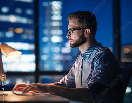 work, night, overtime, office, computer, computer scientist, man, glasses, concentration, corporation, person