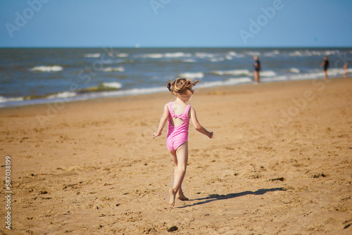Preschooler girl having fun on the sand beach at sea coast in Noordwijk, the Netherlands