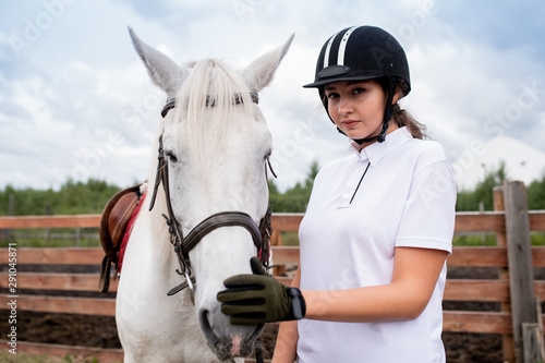 Pretty girl in equestrian helmet and gloves touching nose of white racehorse