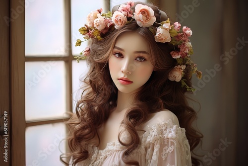 attractive, girl, woman, vintage, coiffure, bridal, flower, crown, make-up, fashion, bride, beauty, face, hair, wedding, dress, glamour, luxury, person, lady, princess, make-up, elegance, celtic, gown, fare, long, skin, model, blond, jewellery, style, queen, pink, headband, chaplet, dreamy, old, mediaeval, closeup, closeup, natural, dream, fantasy, atmosphere, pretty, curly