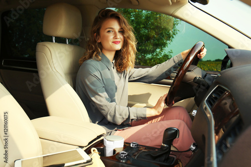Pretty young woman driving car