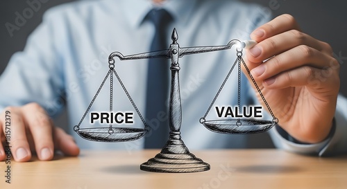 Price and Value Scales with Hand on Light Wood Table