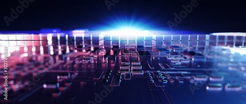 Printed circuit board futuristic server/Circuit board futuristic server code processing. Orange, green, blue technology background with bokeh. 3d rendering