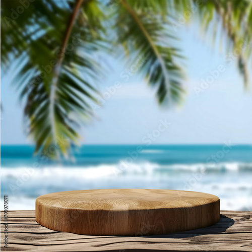 product display on wooden podium with blurred sea tropical beach