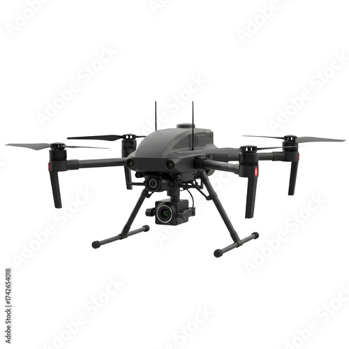Professional gray drone with camera and propellers isolated on transparent background