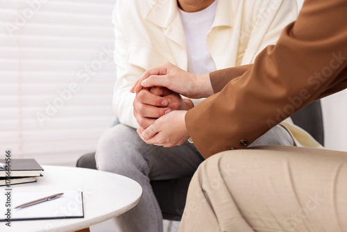 Professional psychologist supporting patient during therapy in office, closeup