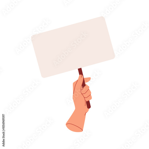 Protest sign board in hand. Holding blank placard, clean horizontal poster, banner for strike, riot, revolution. Empty space, signboard on stick. Flat vector illustration isolated on white background