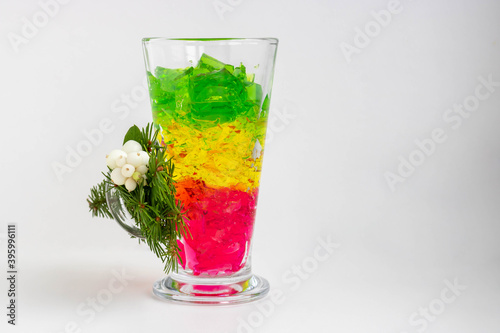 Puff jelly in a glass on a white background with green branches of spruce and white berries of brilliant dogwood