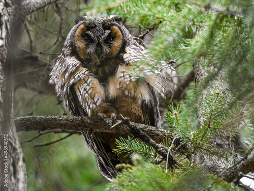 Puffed Long-eared Owl sitting on pine tree branch in early spring