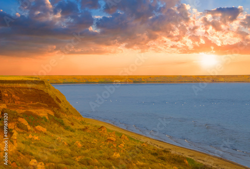 quiet sea bay at the dramatic sunset, natural summer sea vacation scene