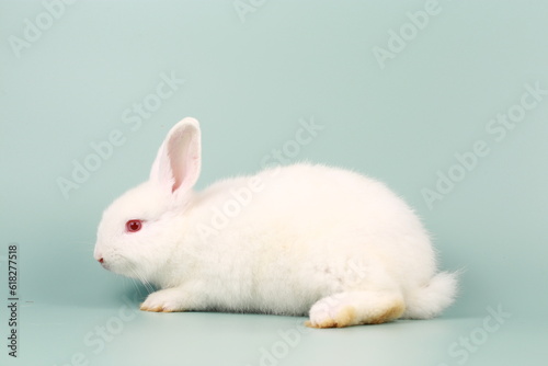 Rabbit on green pastel screen. Little bunny action. Cute pet for clinic or Vet banner.
