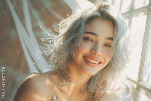 grey, woman, smiling, sunlit, hair, window, natural light, casual attire, relaxed, joy, beauty, lifestyle, wellness, young, vibrant, warm, genuine, pose, promotion, editorial, sunlight, happiness, portrait, cheerful, modern, fresh, serene, youthful, expressive, intimate, content, bright, soft, everyday, candid, engaging, friendly, authentic, carefree, radiant, charming, fashion, face, model, lady, eye, smile