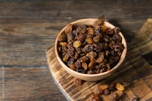 Raisins in a wooden bowl on a wooden table. Rustic style