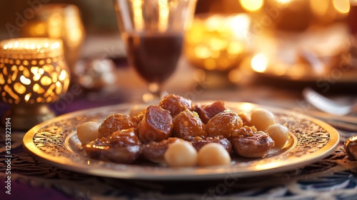 Ramadan Background. dining table. Design creative concept of islamic celebration day ramadan kareem or eid al fitr adha, copy space text area, 3D illustration.