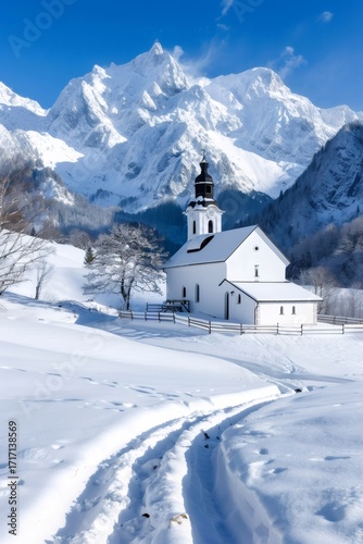 church, austria, winter, snow, mountain, landscape, sunny, scenic, religion, christianity, building, travel, nature, cold, white, blue, sky, tree, forest, alpine, vale, holiday, christmas, season, europa, destination, tour tourism, picturesque, tranquil, serene, beautiful