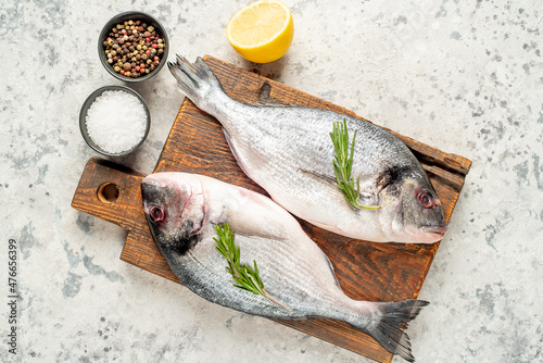 raw dorado fish on a light stone background