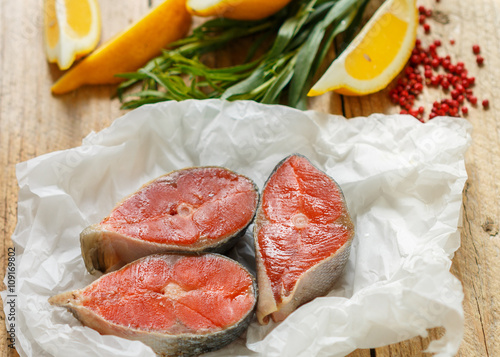 Raw fresh salmon steaks, fresh tarragon, lemon, salt and pepper.