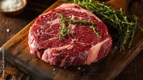 steak, meat, raw, food, beef, ingredient, cooking, fresh, texture, closeup, wooden, board, herb, rosemary, parsley, brown, red, cut, ribeye, epicure, preparation, protein, meal, kitchen, eatery, dinner, lunch, eat, delicious, healthy, isolated, studio, background, rustic, diet, nourishment, cook, natural, organic, slice, tender, favor, juicy, fat, marbling, surface, view, vertical