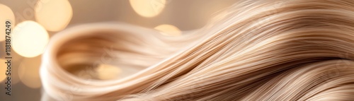 Realistic blonde clipin extensions, scattered on a glass table, surrounded by golden lighting