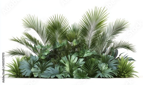 Realistic palm leaves and shrubs positioned in the corner on a white background, symbolizing natures beauty and the calming effect of tropical plant life, Generative AI