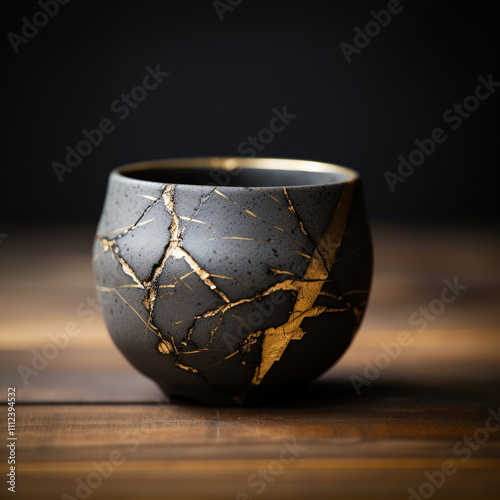 Reconstructed Japanese clay ceremonial teacup, gray and gold, antique, cup, bowl, old, ceramic, gold, cracked, pottery, priceless, old, historical.