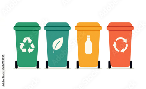 Recycling Bin Icons. Four color-coded bins with eco symbols for recycling, compost, glass, and general waste on a white background.