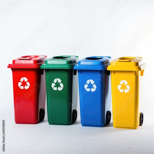 Recycling Bins Set, Garbage bins in 4 Different Color, Color coded garbage bins with recycling symbols.