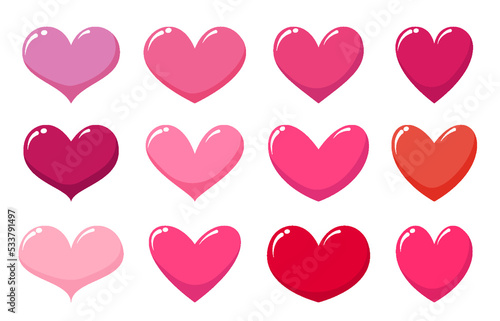 Red and pink hearts cartoon glossy icon set. Valentines Day heart shape candy. Romantic flat love sign. Like social media chat symbol. Decorative web buttons