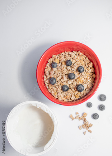 red bowl with cereals, blueberries and yogurt