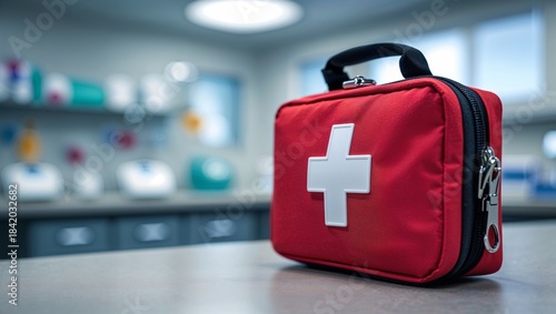 Red first aid kit with white cross symbol on a counter in a medical setting