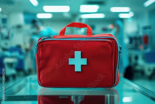 Red first-aid kit in a medical facility.