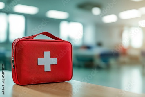 Red first-aid kit on a table.