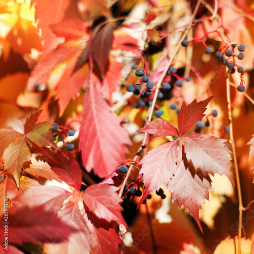 Red girlish grape leaves on blurred foliage background close up, autumn yellow leaves macro, warm fall season sunny day nature image, Parthenocissus, Virginia creeper climber plant, copy space