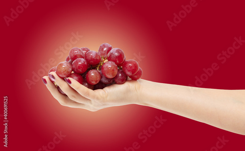 Red grapes in hand isolated on red