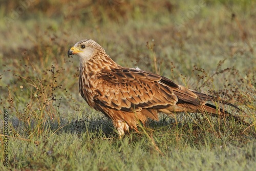 Red kite (Milvus milvus), adult in the grass with morning dew, Allgäu, Bavaria, Germany, Europe