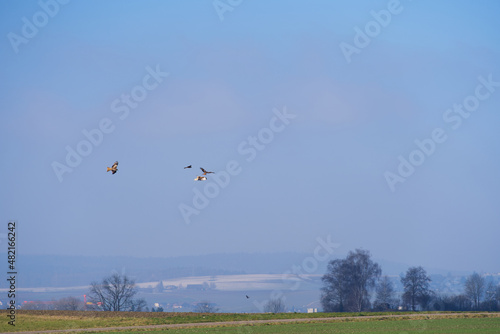 Red kite (Milvus Milvus) circling in the sky on a sunny winter day with blue sky background. Photo taken January 13th, 2022, Zurich, Switzerland.