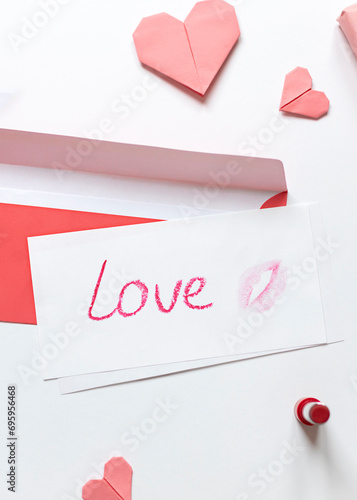 Red paper envelope with white blanks, word love written with red lipstick and pink origami hearts. Valentine's day concept card.
