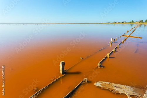 salt, saline, red, remain, construction, bridge, abandon, calamity, water, river, lake, duck pond, puddle, reservoir, calm, mirror, sky, bright, blue, celestial, serene, day, landscape, scene, panoramic