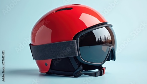 Red ski helmet with integrated goggles reflects winter forest scene. Protective headwear is essential gear for snow sports. Secure fit ensures rider safety on slopes.