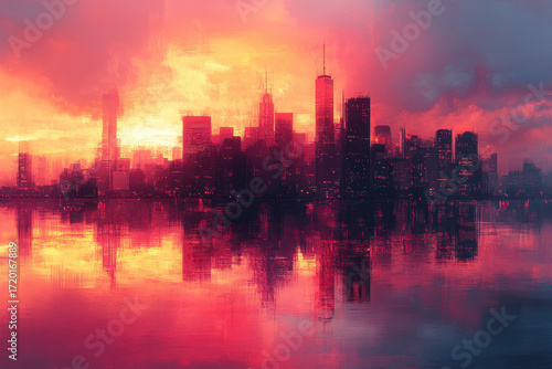 Red sky over city skyline with clouds.