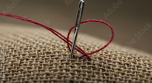 Red thread and needle going through burlap fabric