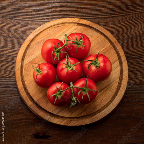 red tomatoes on a wooden cutting board, isolated against a wooden background