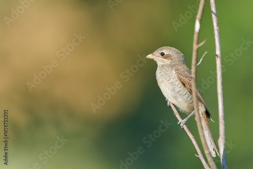 Red-backed shrike (Lanius collurio) juvenile perched on branch with green blurred background and copy space, common species in Czech nature.