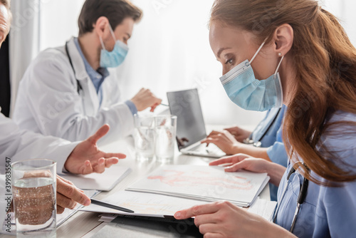 Redhead nurse looking at paper folder with pictures while sitting near doctor pointing with pen near colleagues on blurred background