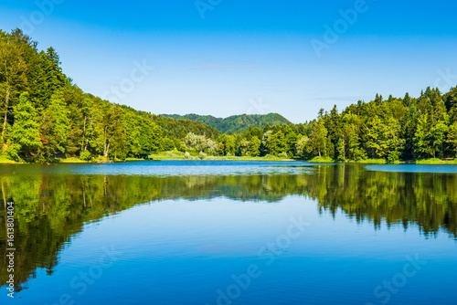 Reflection of forest on Trakoscan lake in Zagorje, Croatia, amazing nature landscape