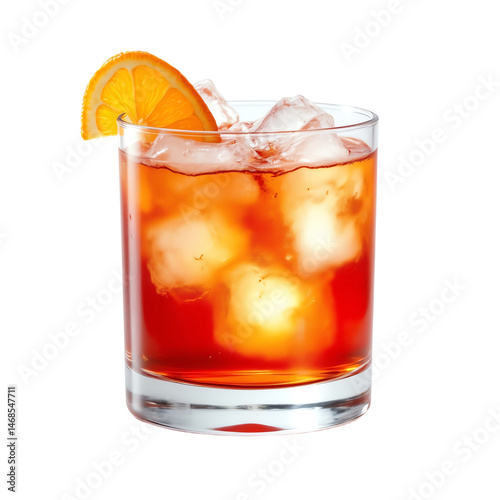 Refreshing beverage with ice and citrus garnish.