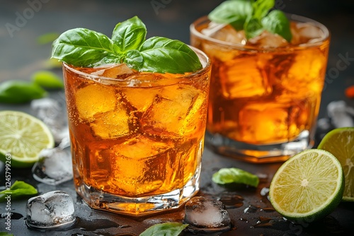 Refreshing Citrus Summer Drink with Fresh Basil and Ice Cubes for Seasonal Parties