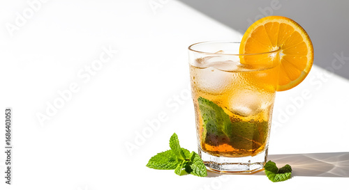 Refreshing iced tea or rum cocktail with fresh mint and an orange slice garnish in summer sun with large copy space for text.
