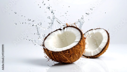 coconut, water, splash, fruit, tropical, food, healthy, drink, fresh, exotic, nature, hydratation, liquid, white, background, cut, half, refreshing, isolated, raw, organic, summer, juice, dessert, nourishment, diet, health, natural, wellness, vacation, travel, epicure, beverage, water, burst, closeup, macro, clean, dripped, bright, vibrant, beauty, isolated on white, studio shot, food photography, closeup